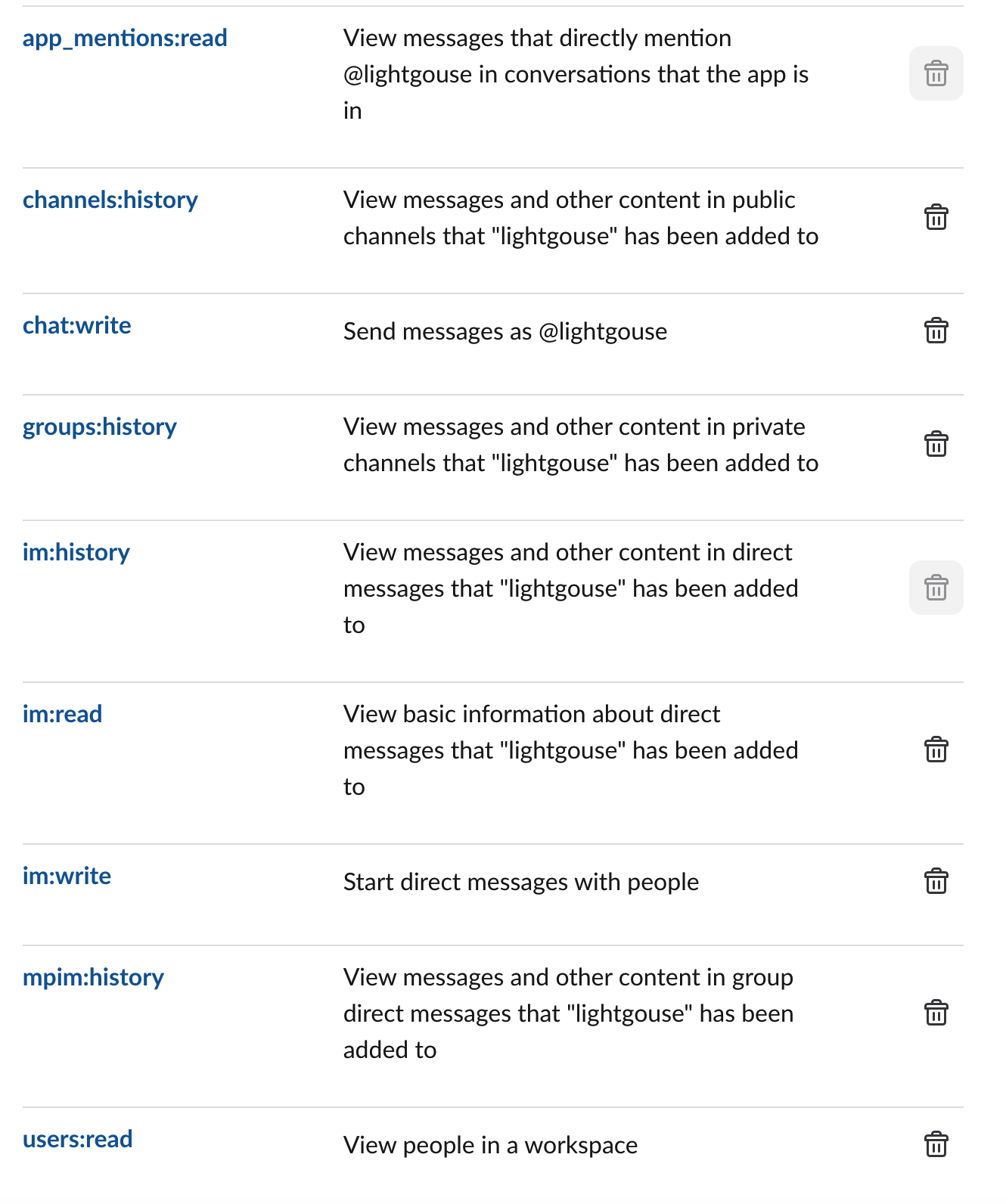 选择Bot scopes(Bot 权限),添加以下权限: