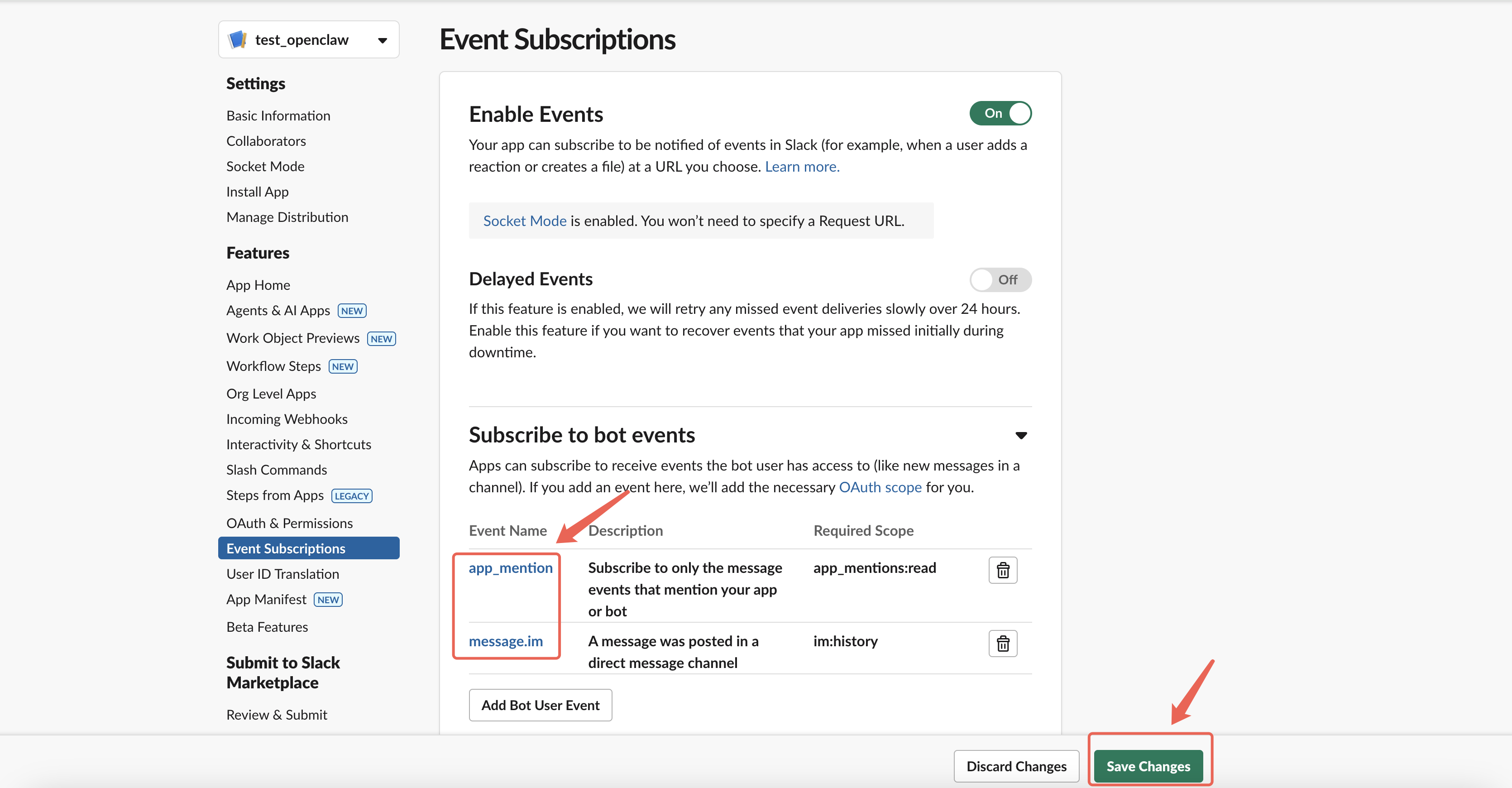开启事件后,点击Subscribe to bot events(订阅 Bot 相关事件通知),点击Add Bot User Event添加事件:app_mention、message.im,如下图所示(本教程仅添加两个基础订阅配置),添加完成后点击页面底部Save Changes。继续后续步骤。