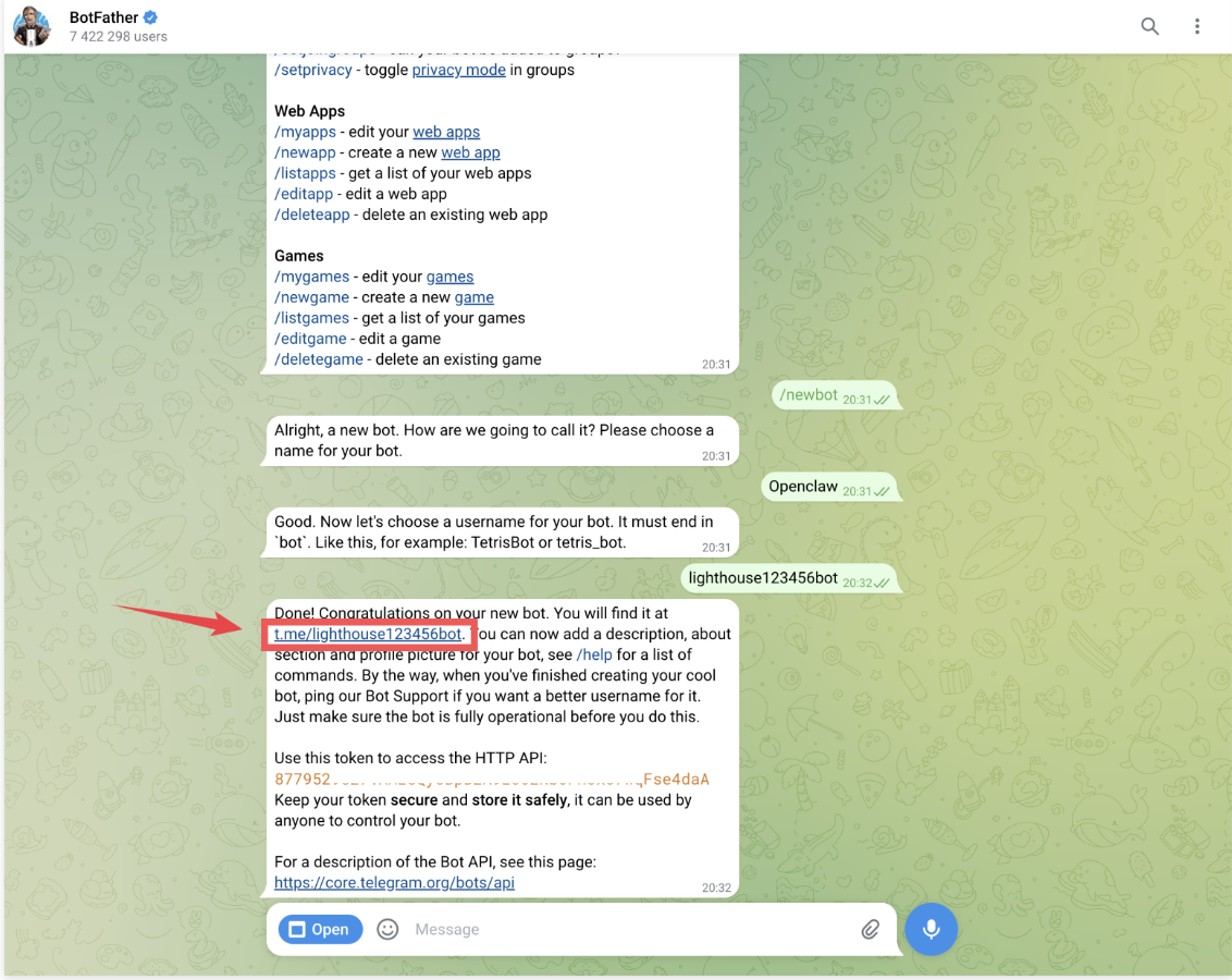 8.Mulai Mengobrol: Setelah koneksi berhasil, kembali ke Telegram lalu klik tautan bot yang disediakan untuk menemukan bot Anda.