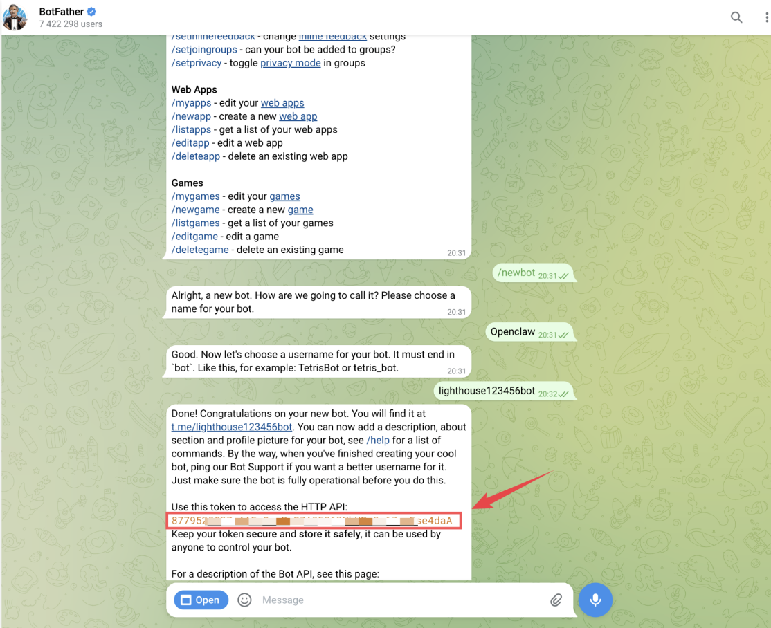7.Dapatkan Token: Setelah username berhasil ditetapkan, BotFather akan mengirimkan pesan yang berisi API Token Anda. Ketuk Token tersebut untuk menyalinnya secara otomatis.