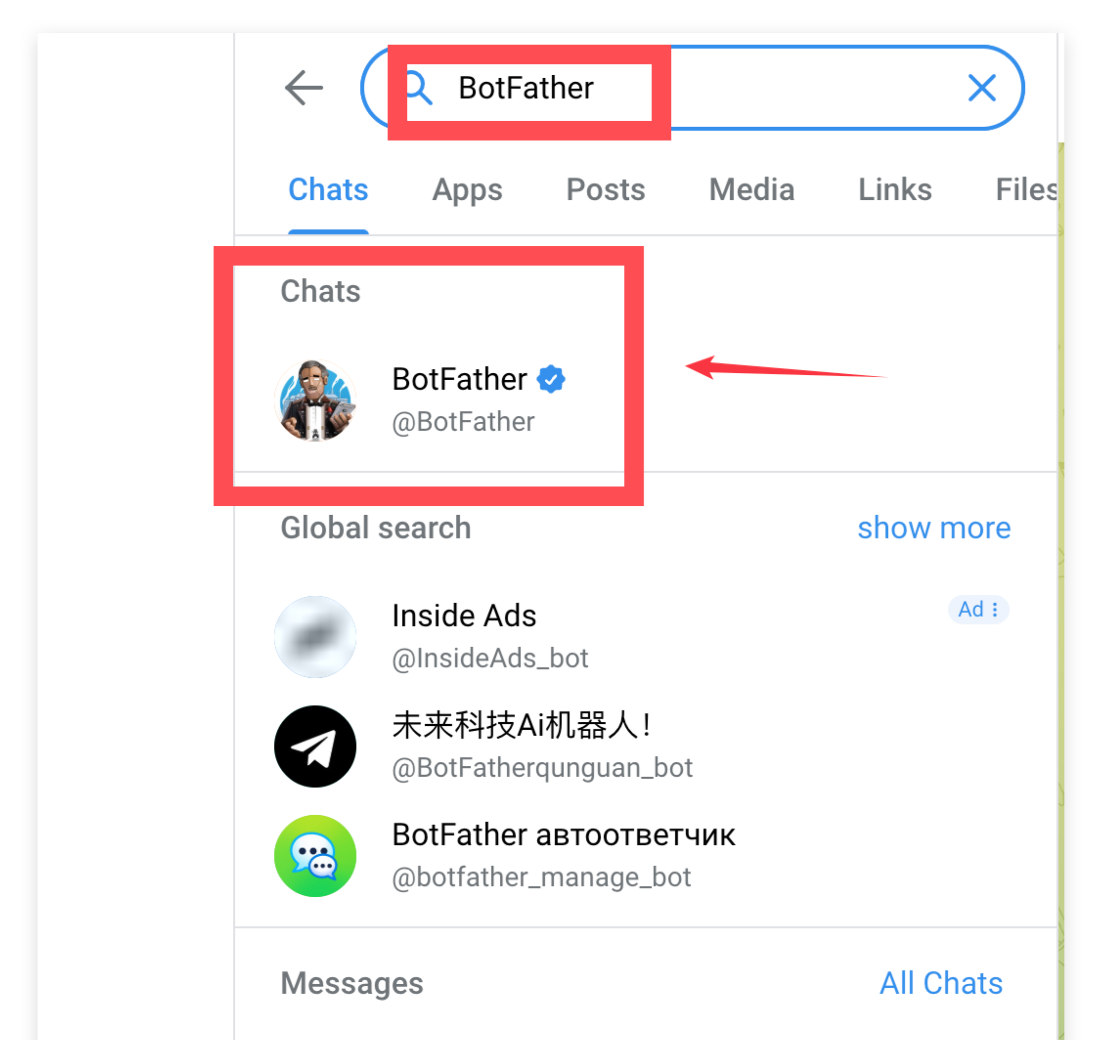 Buka** Telegram **dan cari BotFather: Cari @BotFather di bilah pencarian. Pilih akun resmi dengan tanda centang verifikasi biru.