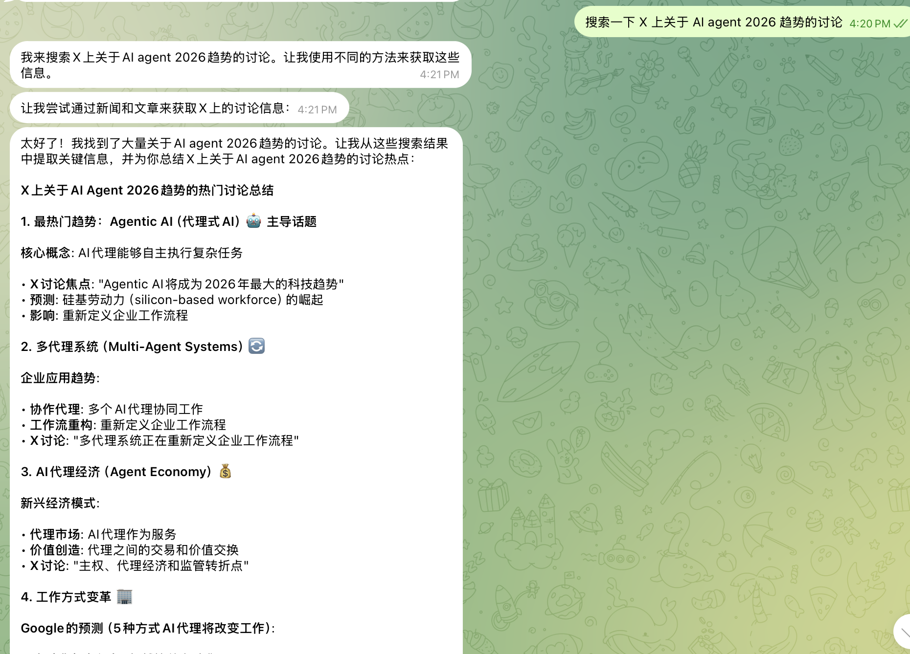 | 定时监控 | 设置定时任务,自动追踪特定话题 | "每天早上9点帮我汇总AI圈的热门讨论" |