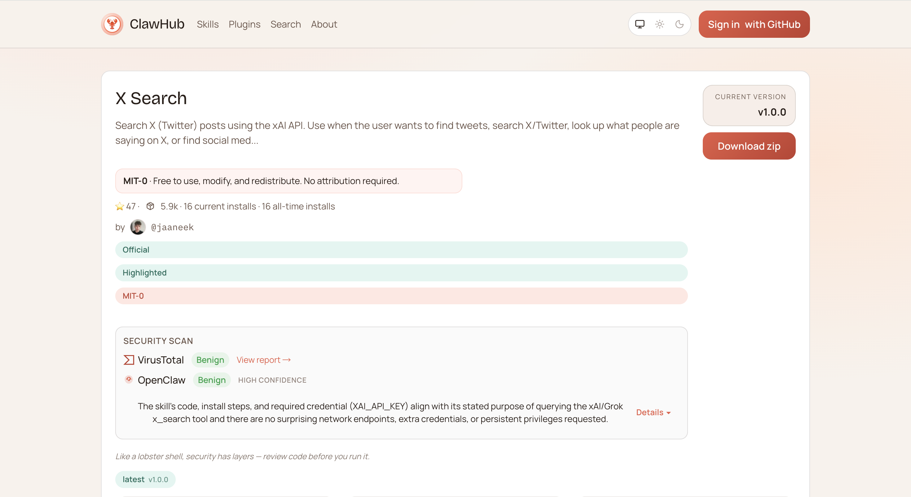 | 技能地址 | https://clawhub.ai/jaaneek/x-search |