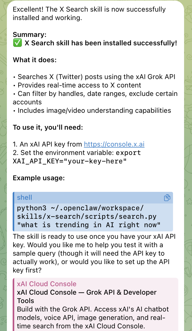 恭喜你!现在你的 OpenClaw 已经拥有了搜索 X 的超能力!