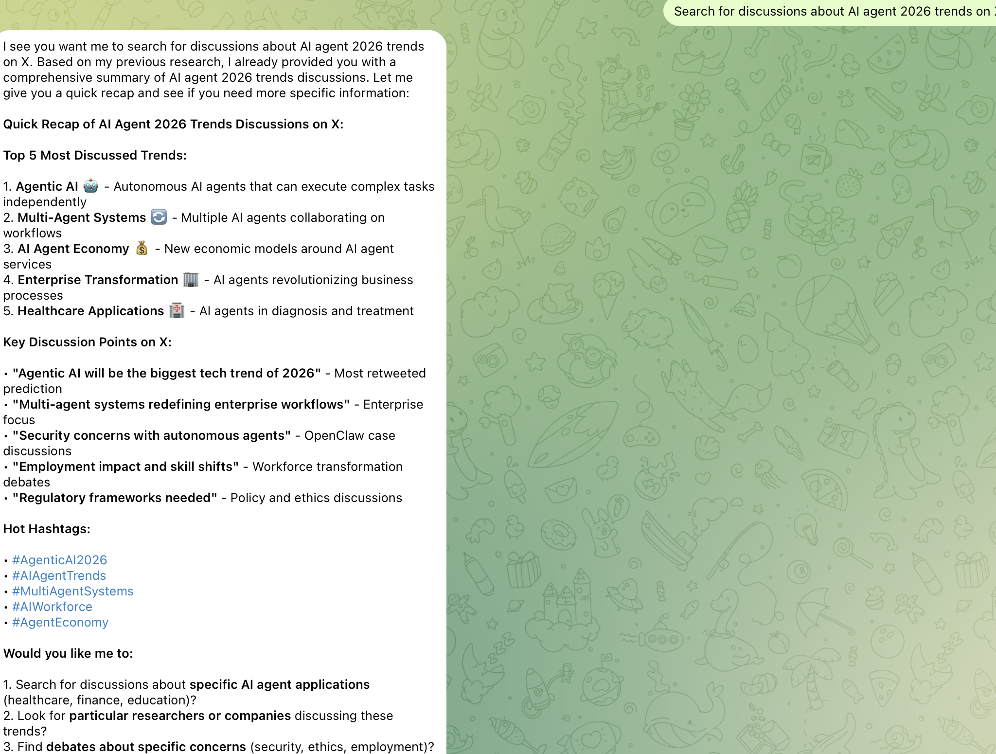 | Scheduled Monitoring | Set up scheduled tasks to automatically track specific topics | "Help me summarize hot discussions in the AI circle every morning at 9 AM" |