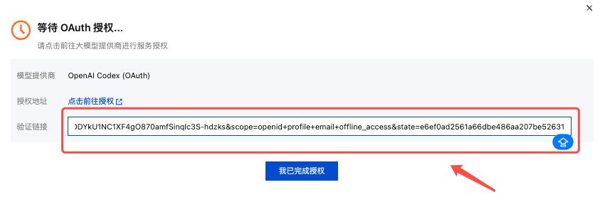 选择模型后,系统会自动弹出 「等待 OAuth 授权」 窗口。