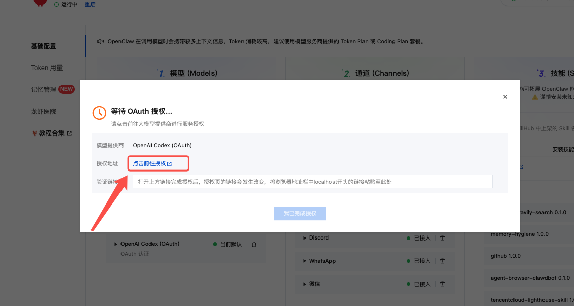 现在 回到 OpenClaw 的授权等待窗口: