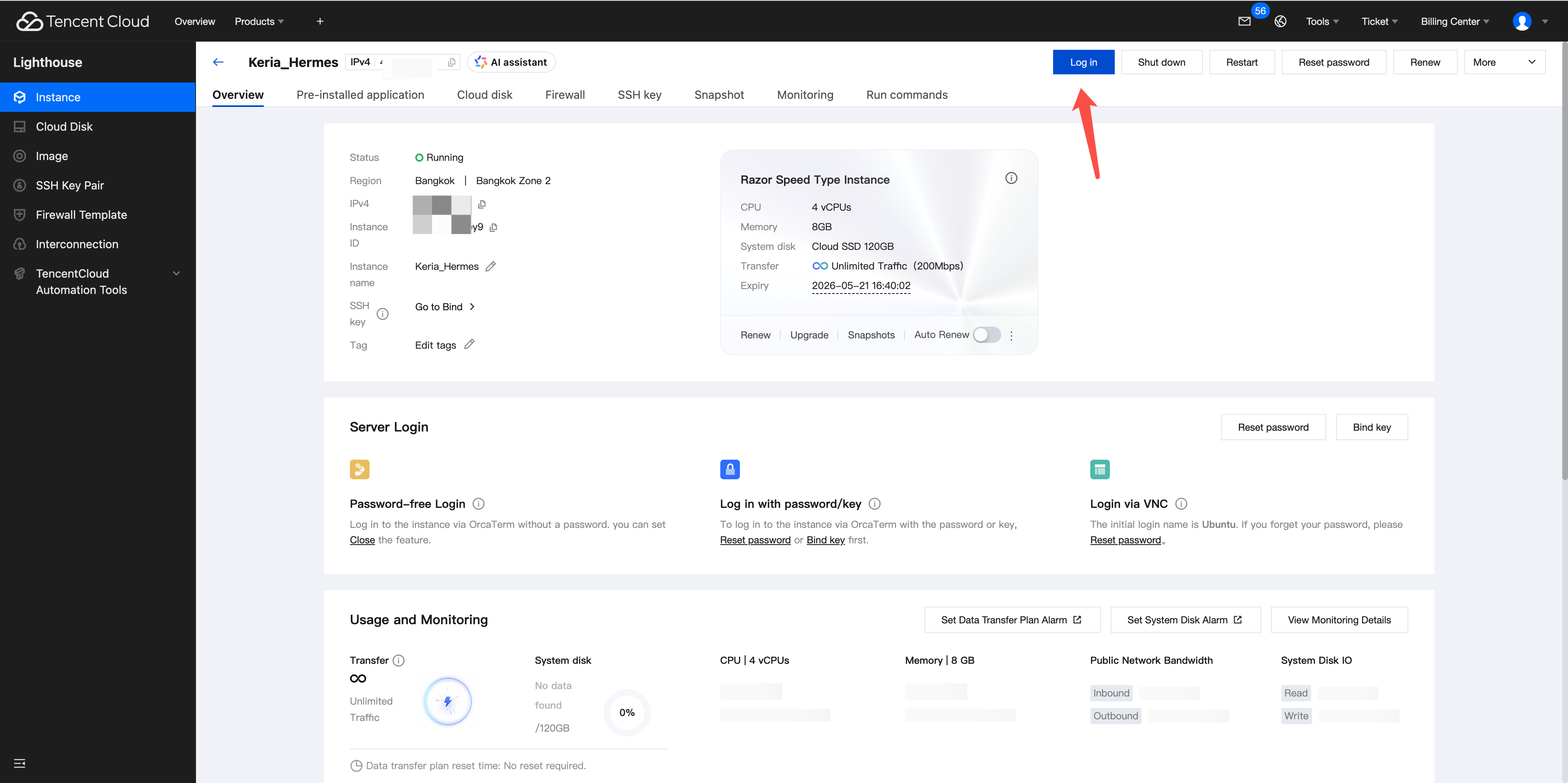 Klik tombol Masuk pada kartu instance, dan browser akan secara otomatis mengarahkan ke alat terminal web Tencent Cloud, OrcaTerm.