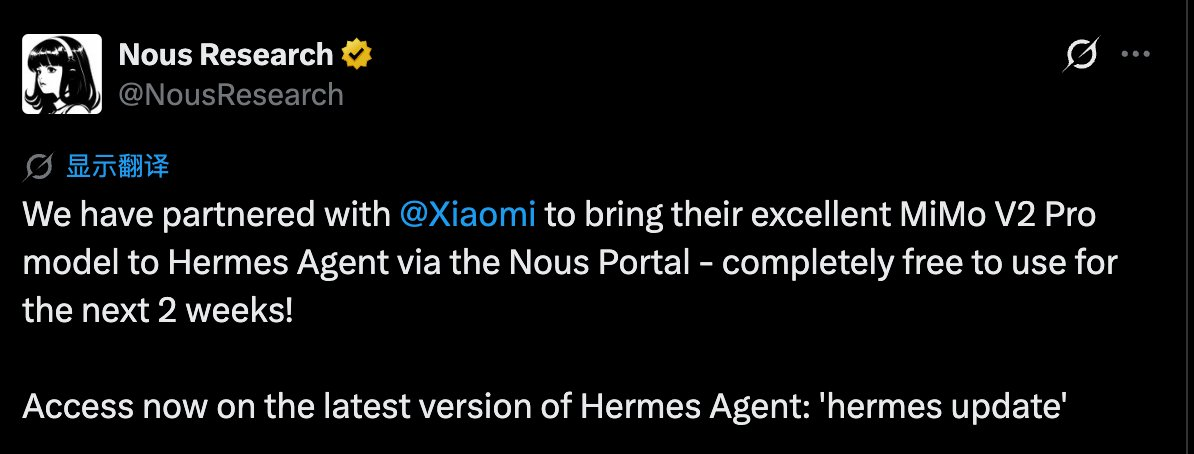 🚨🚨🚨 重要提醒:小米 MiMo V2 Pro 的免费试用活动仅限两周,截止日期为 2026 年 4 月 22 日 。之后调用该模型将按照 Nous Portal 的标准资费计费。