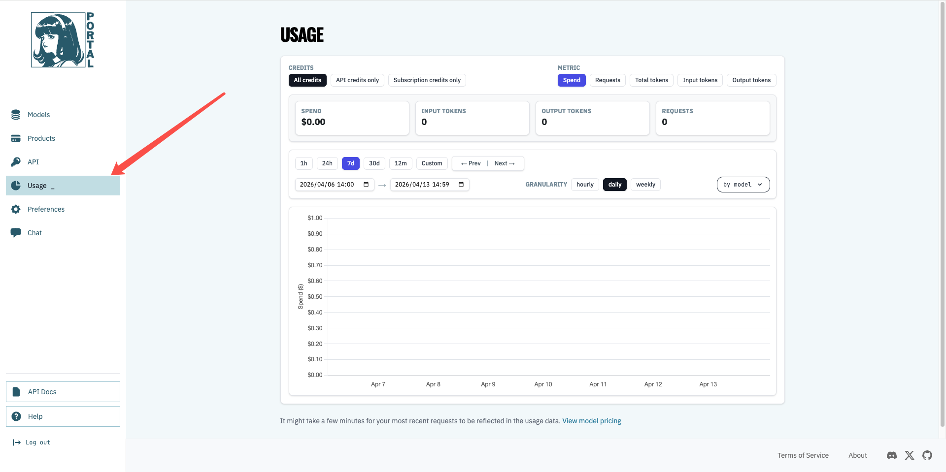 想知道自己用了多少 Token?可以随时登录 portal.nousresearch.com,点击左侧菜单的 Usage 选项查看详细的消耗统计。