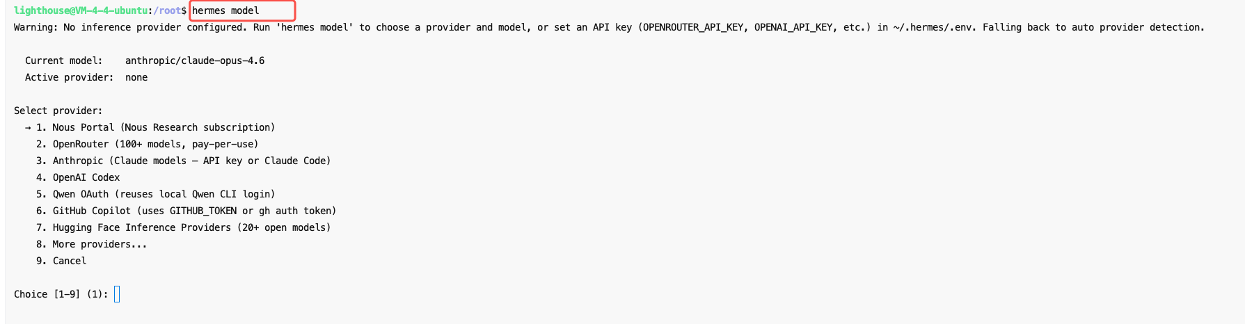这个命令是 Hermes 的模型管理入口,它可以帮你统一切换和配置所有支持的 AI 供应商(包括 OpenAI、Anthropic、Nous Portal 等)。