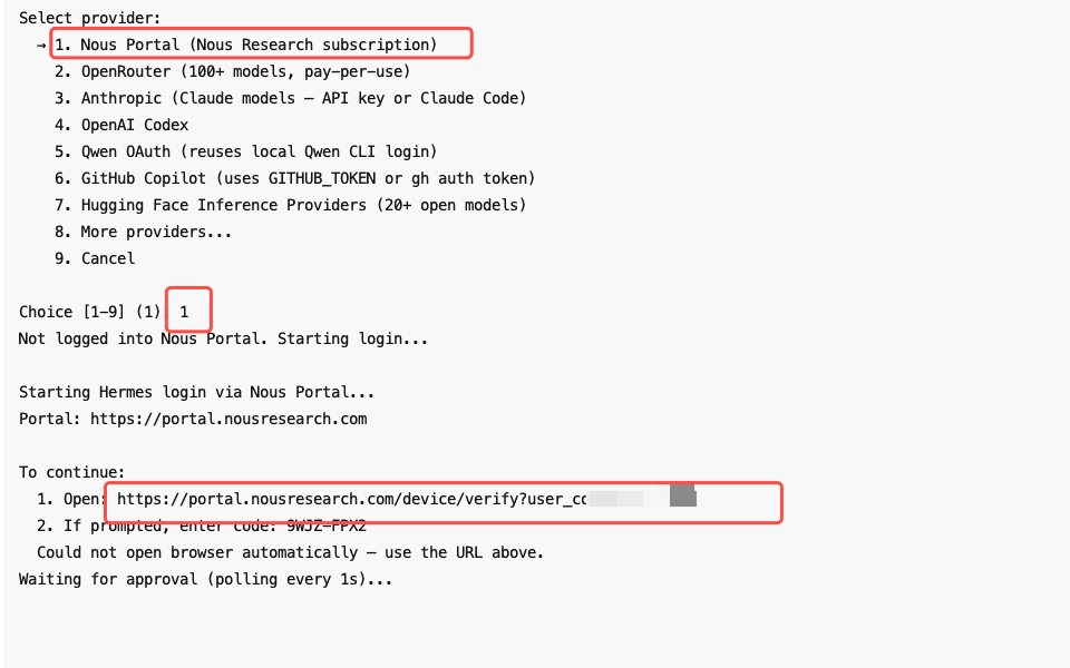 选择 Nous Portal 后,Hermes 会自动启动 OAuth 登录流程。你会在终端看到类似这样的提示: