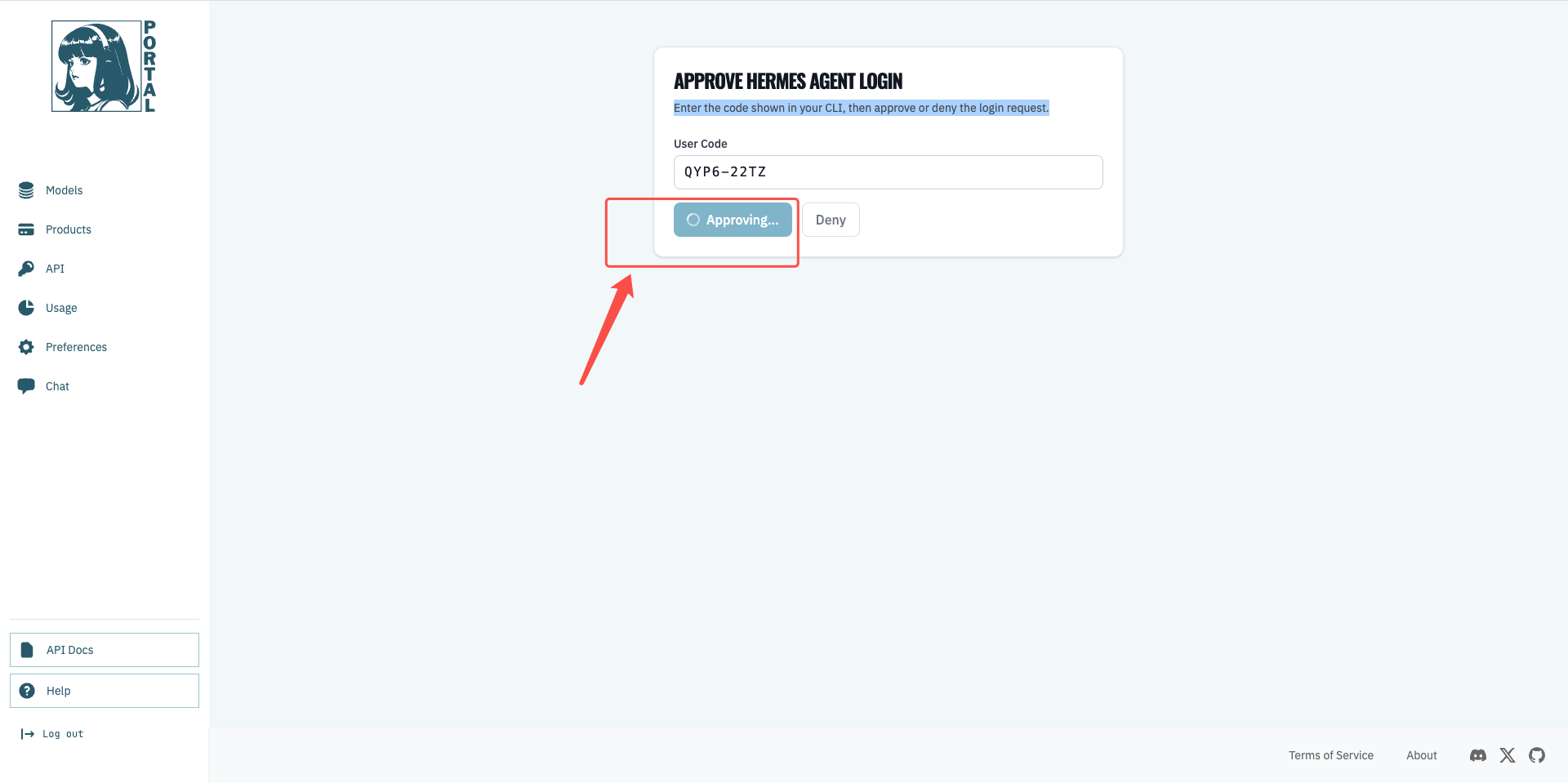 这个页面会显示一个 User Code(设备验证码)。在点击确认之前,请务必核对一下:页面上显示的 Code 是否与你终端中显示的一致。这是为了确保你授权的是自己的 Hermes 实例,而不是其他人的设备。