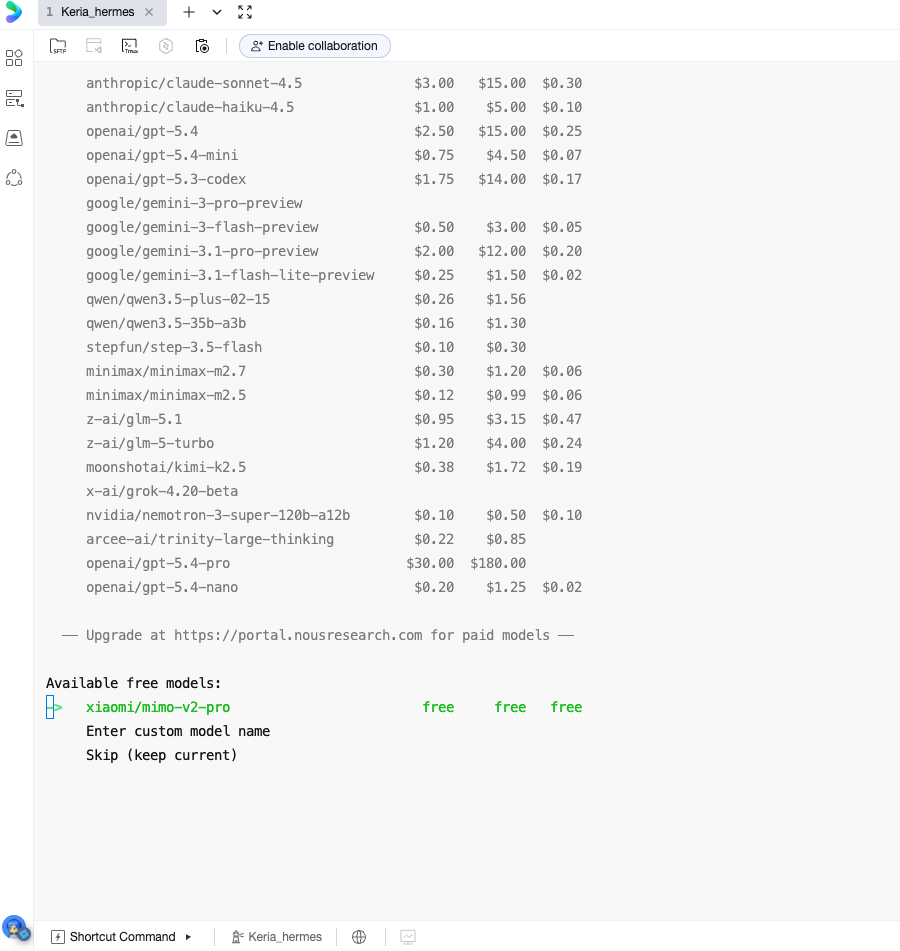 执行后,终端会显示一个供应商选择列表。这里我们需要选择 Nous Portal——因为小米的 MiMo 模型是通过 Nous Research 的平台进行分发的,而不是直接对接小米。