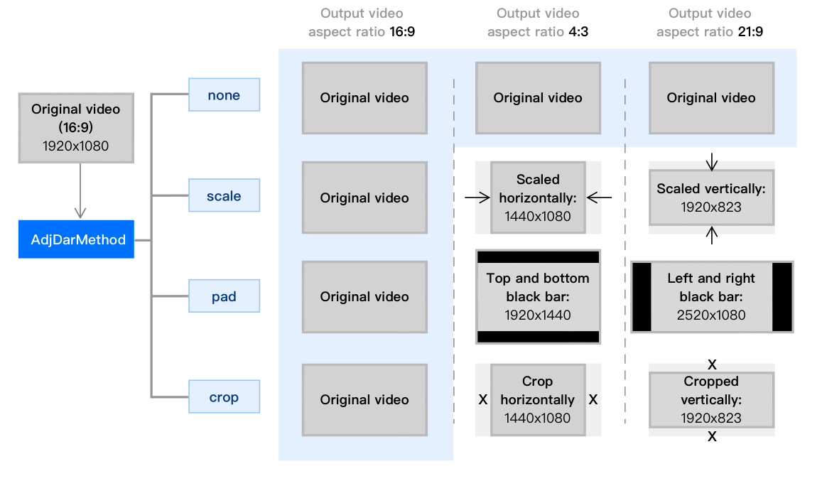 AdjDarMethod | Request.TransConfig | 分辨率调整方式 | String | 否 | none | 取值 scale、crop、pad、none 当输出视频的宽高比与原视频不等时,根据此参数做分辨率的相应调整 |