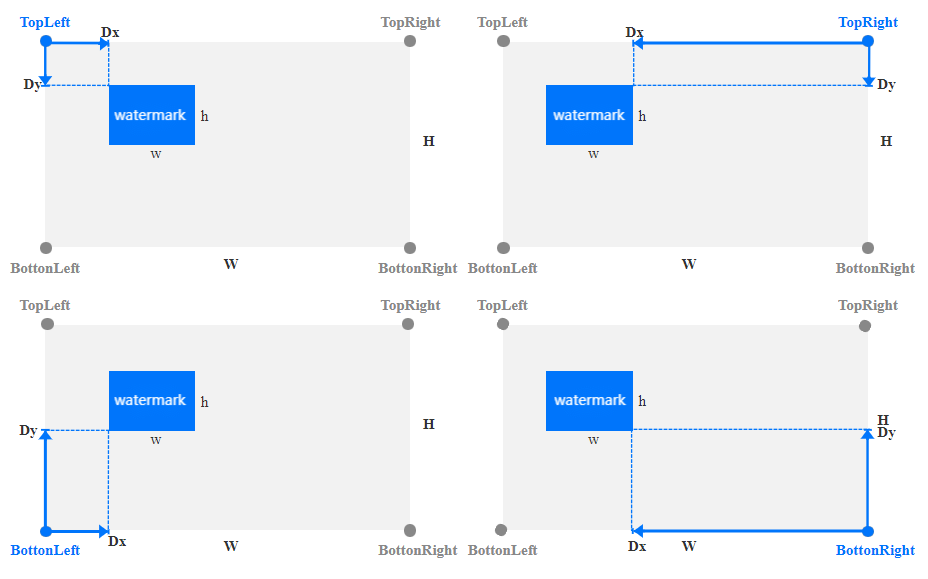 Dx | Request.Watermark | 水平偏移 | String | 是 | 无 | 1. 在图片水印中,如果 Background 为 true,当 locMode 为 Relativity 时,为%,值范围:[-300 0];当 locMode 为 Absolute 时,为 px,值范围:[-4096 0]。 2. 在图片水印中,如果 Background 为 false,当 locMode 为 Relativity 时,为%,值范围:[0 100];当 locMode 为 Absolute 时,为 px,值范围:[0 4096]。 3. 在文字水印中,当 locMode 为 Relativity 时,为%,值范围:[0 100];当 locMode 为 Absolute 时,为 px,值范围:[0 4096]。 4. 当Pos为Top、Bottom和Center时,该参数无效。 |