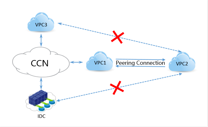 例如,如下图所示,VPC1 与 VPC2 间已建立了对等连接,将 VPC1 加入一个云联网后,仅有 VPC1 可以和云联网中网络实例 VPC3、IDC 互通,VPC2 仅能通过对等连接与 VPC1 互通,不能与云联网中其他实例互通。