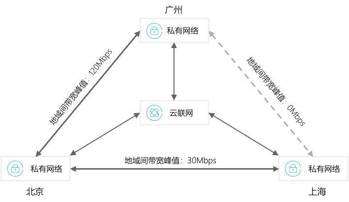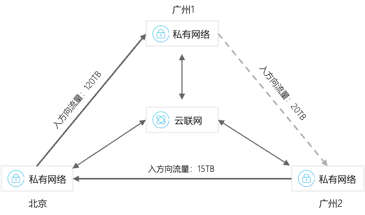 假设您的云联网(服务等级为金)关联有广州、北京、上海三个地域的网络实例,地域间出方向流量如下图所示: