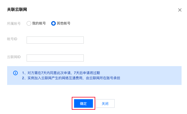 4. 单击确定,即可向云联网所属账号发送关联申请。