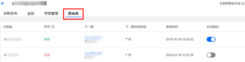 1. 登录 云联网控制台,单击要查看路由的云联网 ID,进入详情页。 2. 单击路由表,查看该云联网路由表。