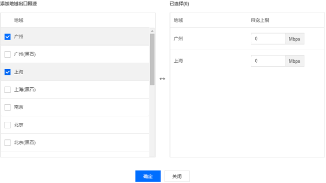 单击调整带宽限速,在弹框中勾选需要限速的地域,填写地域出口的带宽上限,单击确定即可。