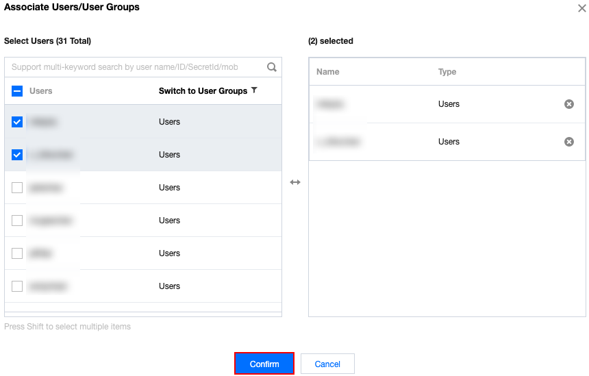 (可选)若需关联用户组,则在“关联用户/用户组”对话框,单击