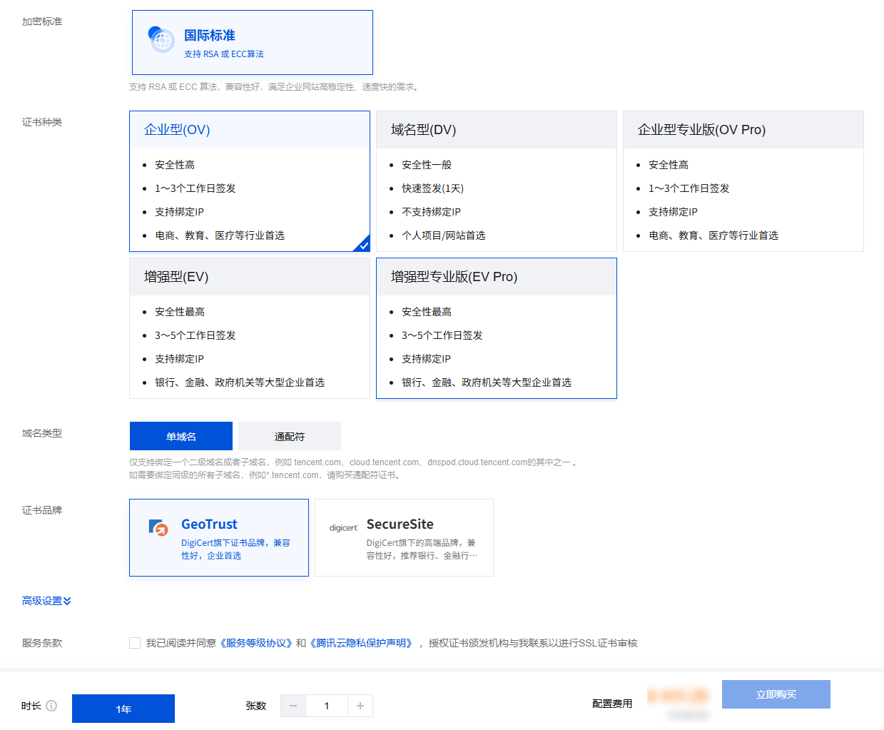 多域名 | 单个证书可以绑定多个域名,最多可以支持数量以控制台展示为准。 | SecureSite 多域名证书的价格即按域名数目进行叠加。GeoTrust、TrustAsia、GlobalSign、Wotrus、DNSPod 多域名证书除默认支持域名数量外,附加域名再另叠加计价。 |