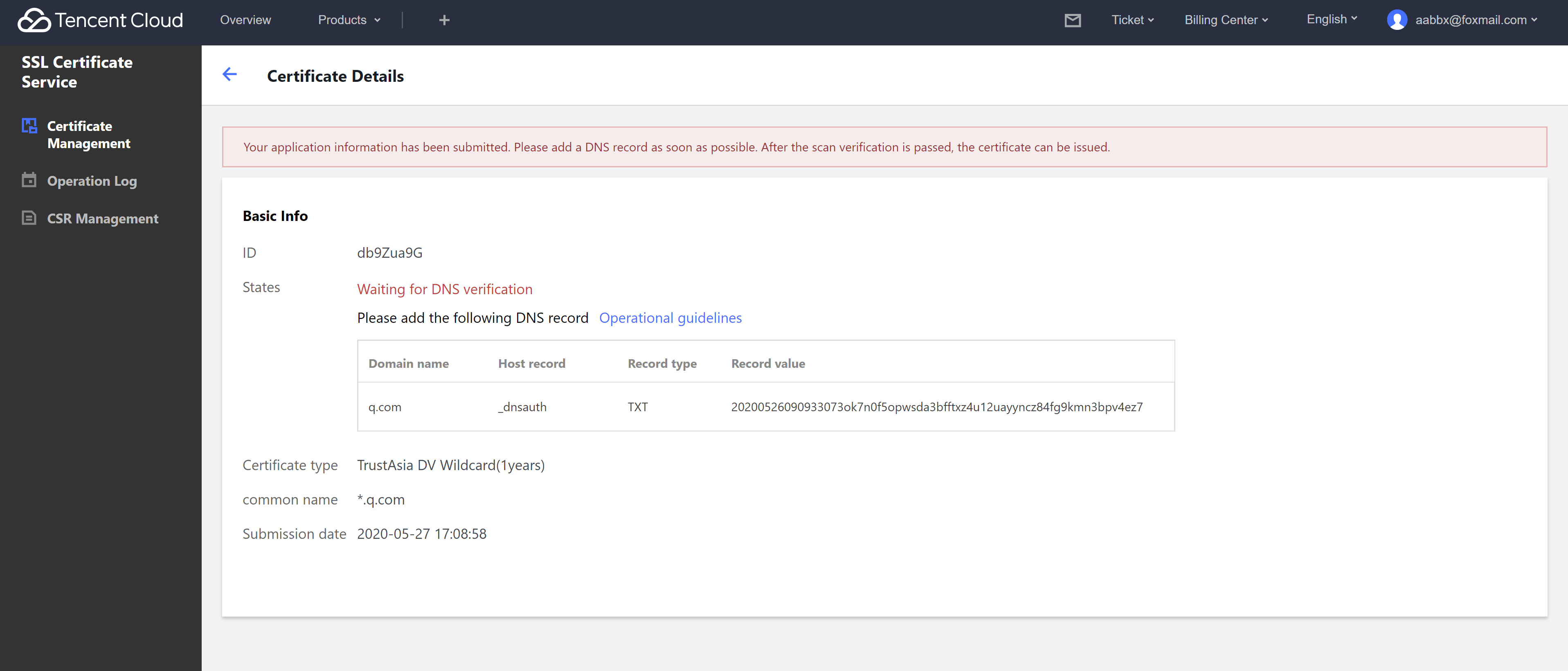 2. 证书详情中会生成解析验证值,您需要添加该条 DNS 解析记录。记录添加完成后,等待 CA 机构扫描验证,验证审核通过后会立即颁发证书。如下图所示: