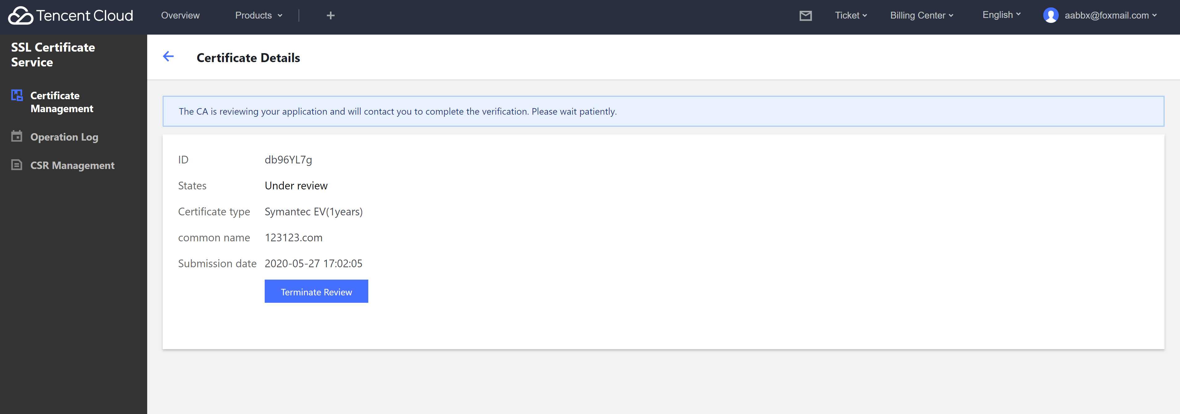 1. 购买成功后,SSL 证书管理控制台的证书列表中将生成一个新的证书,状态为待验证,单击详情进入证书详情页。