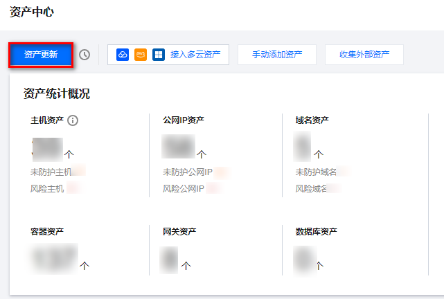 在 资产中心页面,单击左上角的资产更新,云安全中心会自动获取腾讯云上的资产信息,并展示在下发列表;如果资产较多,该过程可能需要3~5分钟,如需更新容器资产需要更长时间。 说明: