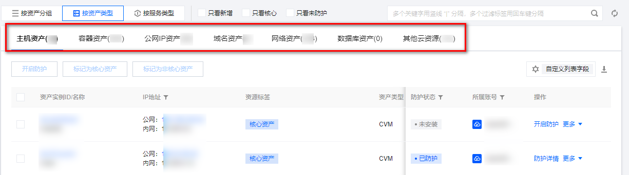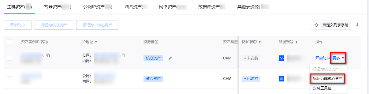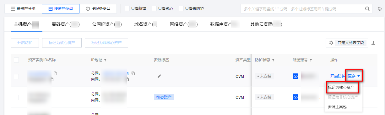 在 资产中心页面,选择目标非核心资产,单击更多 > 标记为核心资产。为该资产打上标签,标签会显示在资产名称的右侧。 在 资产中心页面,选择目标核心资产,单击更多 > 标记非核心资产。 在 资产中心页面,可以筛选关注核心/非核心资产。云安全中心会自动同步展示资产的防护情况,对应关系为: 主机资产,使用腾讯云主机安全防护。
