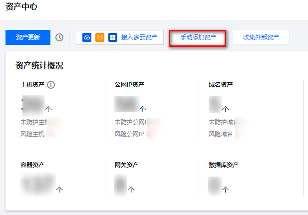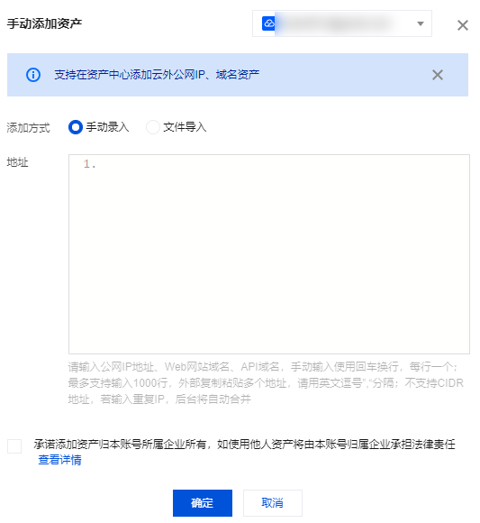 1. 如需管理非腾讯云资产,可以在 资产中心页面,单击左上角手动添加资产。 2. 在手动添加资产弹窗中,输入云外公网 IP、域名资产,勾选服务协议,单击确定。