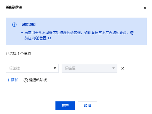 1. 在 资产中心页面,选择目标资产,单击资源标签列下的,可以添加自定义产品标签。 2. 在编辑标签弹窗中,选择标签键和标签值,单击确定。