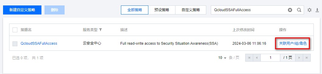 3. 在“QcloudSSAFullAccess”策略的右侧操作栏中,单击关联用户/组/角色。
