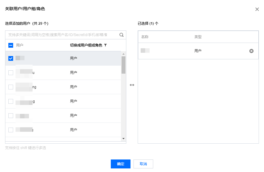 4. 在关联用户/用户组/角色页面,选中需要配置权限的子用户,单击确定即可。