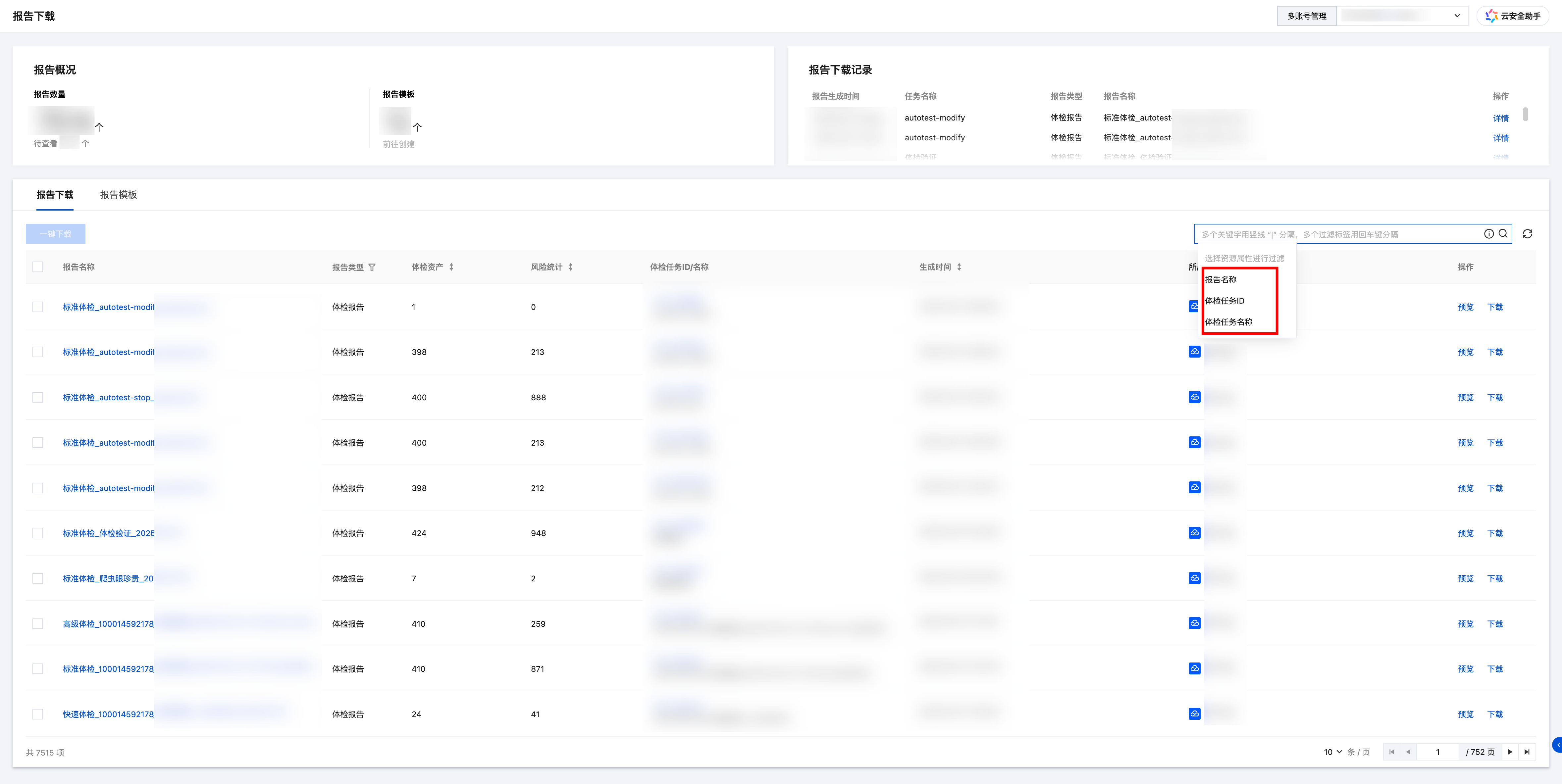在报告下载页面,您可以根据体检任务筛选报告。支持通过