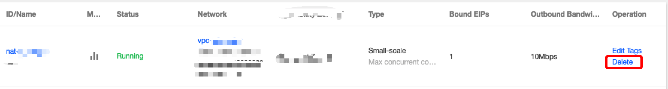 在列表中找到需要删除的 NAT 网关,单击操作栏下的
