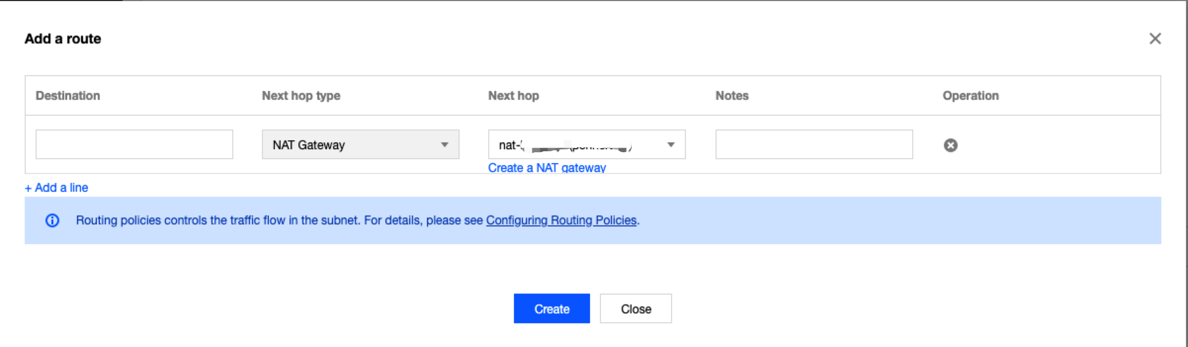 创建 NAT 网关后,需要配置路由规则,将子网流量指向 NAT 网关。