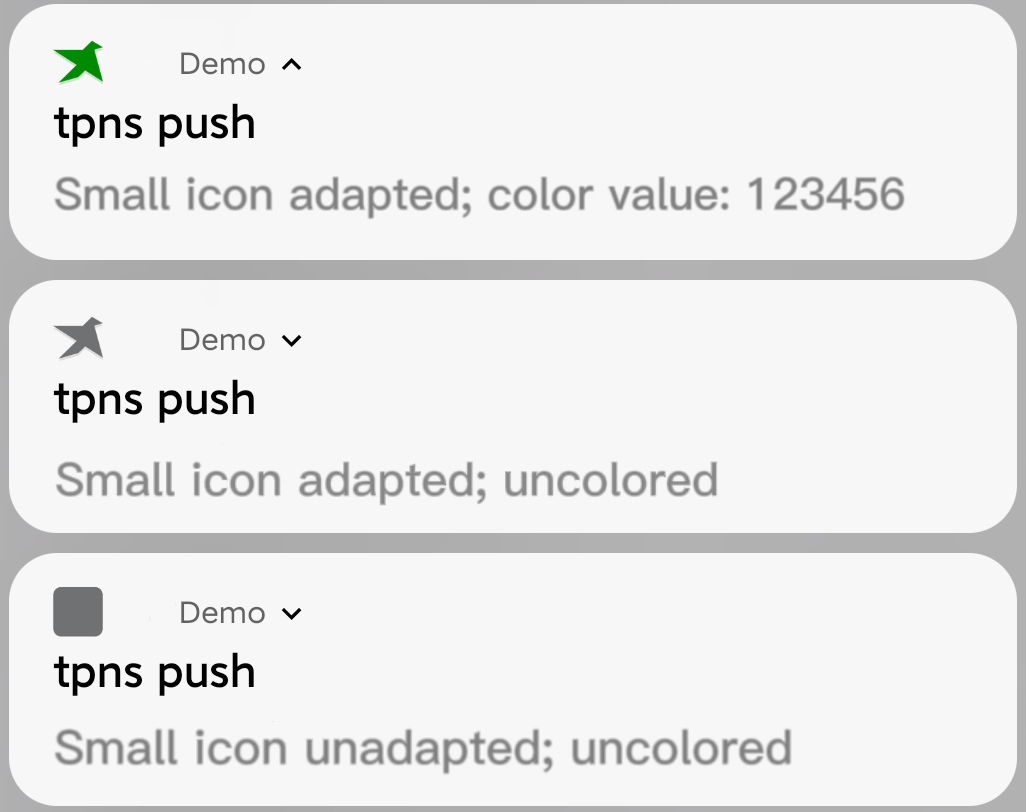 移动推送 Android SDK 1.2.2.0 起,默认情况下 notification_icon.png 小图标资源将仅在谷歌 Pixel 手机上直接生效;其他品牌手机若需实现此类自定义通知小图标效果,还需指定推送 API 字段 message.android.small_icon 为资源文件名称(不带文件后缀);同时自定义通知小图标支持染色为单一纯色,需指定推送 API 字段 message.android.icon_color 为 RGB 颜色的十进制值。