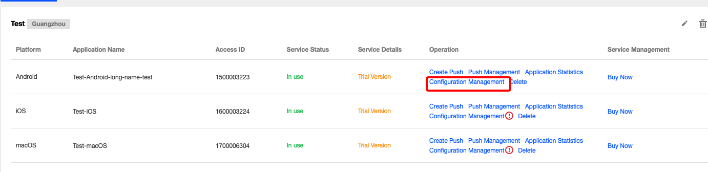 1. 在配置管理页面打开厂商推送通道开关并配置好应用的 AppId、SecretKey 等信息,申请方式可查看各厂商通道的说明文档。
