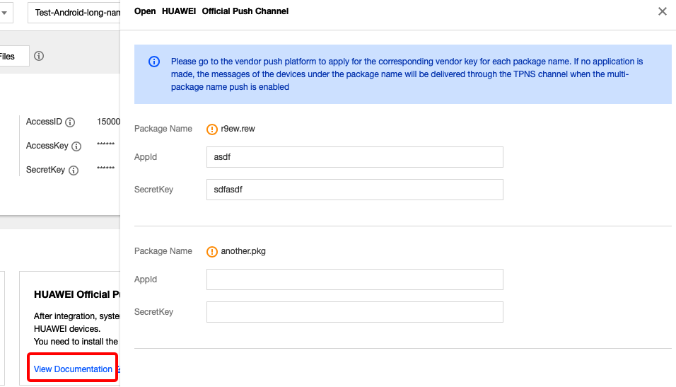 在右侧 AppId、AppKey、AppSecret 处可配置厂商通道信息。