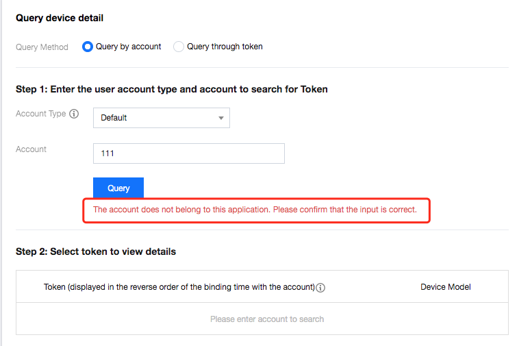 3. 单击下拉框选择您需要查询产品及应用,选择通过账号查询。