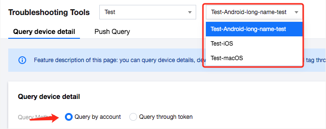 当您在推送消息时出现异常情况(例如推送消息收不到或推送失败)时,可通过排查工具进行自助排查以及通过账号或者 Token 查询设备详情、设备绑定的账号以及设备绑定的标签。