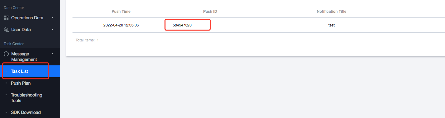 1. 可在左侧导航栏选择 App 推送管理 > 推送任务,获取需要查询的 PushID。