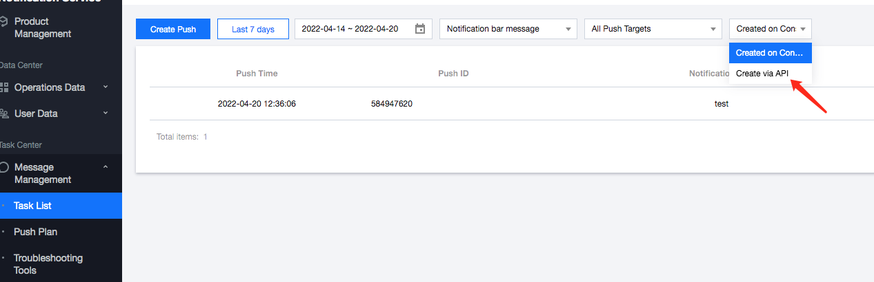 3. 在 App 推送管理 > 推送任务,更换 管理台创建 > API创建 及可查看到 API 推送数据