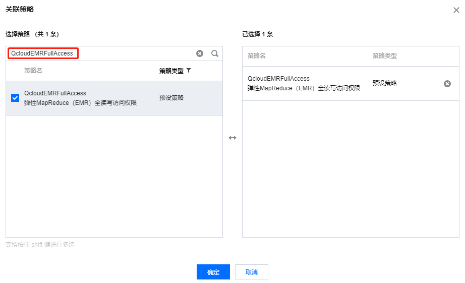2. 在关联策略中搜索以上表格中策略(下图以 QcloudEMRFullAccess 策略为例),选中此策略后,单击确定即可。