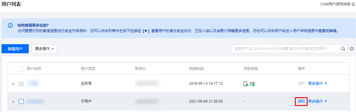 1. 登录 访问管理控制台,在用户 > 用户列表 中找到对应子用户或协助者,单击授权