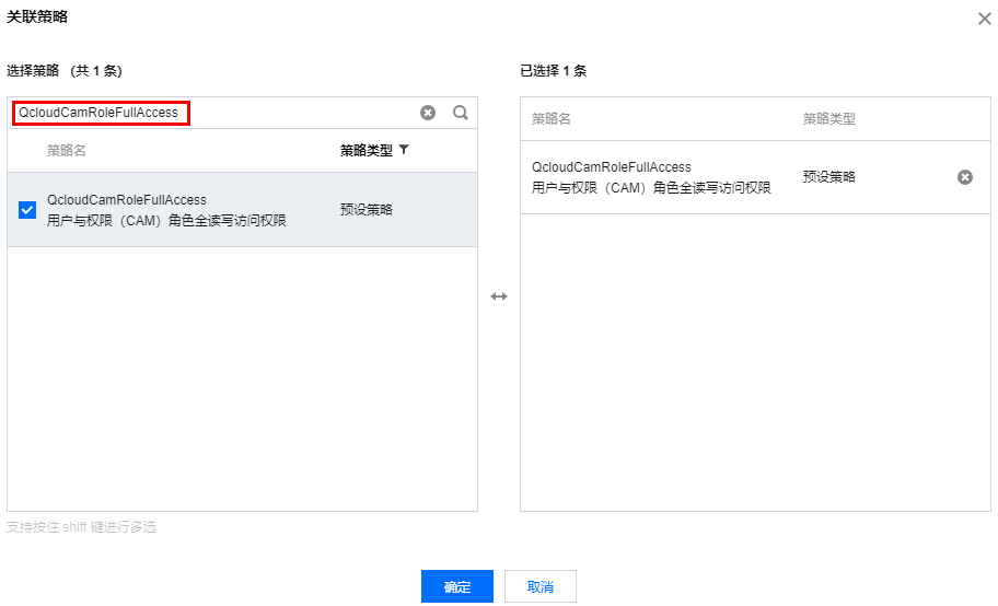 2. 在关联策略中搜索 QcloudCamRoleFullAccess 策略,选中此策略后,单击确定即可。