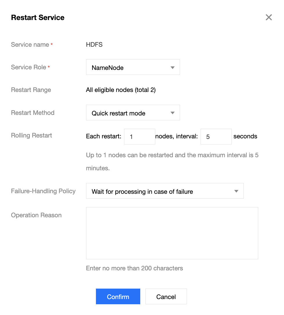 | NameNode | 安全重启模式 | 在 HA 集群中,首先在 standby NameNode 上做 saveNameSpace 操作,然后通过 hadoop-daemon.sh stop | start namenode 进行重启。非 HA 集群与快速重启模式一致 | 只支持滚动重启 |