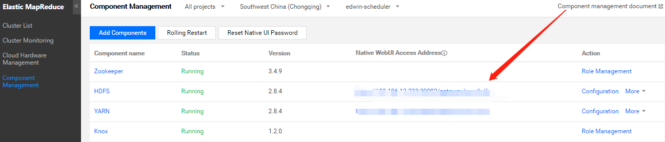 访问地址需要进行身份验证,用户名为 root,默认密码为创建集群时输入的密码,如需修改密码,可在该页面中单击重置原生UI密码进行修改。